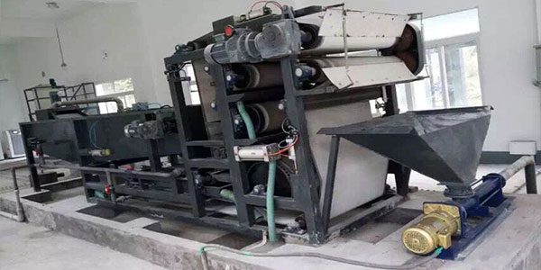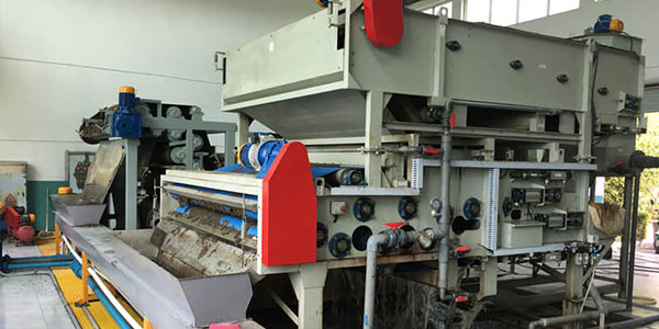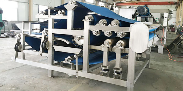 物料經過輸送機,輸送到豆渣脫水機的料斗中,經過螺旋布料器均勻地鋪在濾帶上,濾帶隨著設備的運行,限料板把料層高度刮平,使料的厚度完全均勻一致;然后上下兩條完全漲緊的環狀濾帶夾住料層,在驅動輥帶動下,脫水區內的對輥連續多次機械擠壓,將大量的水份壓出。根據物料的特點自動調節擠壓力,滿足客戶對物料水分要求。