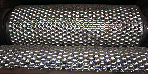 本公司生產(chǎn)的對輥擠壓造粒機,是吸收國外造粒機新技術(shù)的改進型產(chǎn)品。該機結(jié)構(gòu)特點是:安裝了帶有機械震動裝置的預(yù)連續(xù)加料器與強制喂料螺旋加料斗相結(jié)合的喂料系統(tǒng) ,保證了喂料的連續(xù)性、充分性與均勻性,這是至關(guān)重要的一步。在成對軋輥上刻有均布弧槽,有利于物料咬入軋輥,工作時形成弧槽密封腔(帶),也有利于物料的壓實,降低了機組成形壓力與主機負荷,提高了軋片生產(chǎn)率。 該機還配置了軋片成形液壓自動補償加壓裝置,視鏡窗等。粉狀物料經(jīng)斗式提升機后,從加料、螺旋脫氣輸送、軋片、切碎、篩分至粒狀產(chǎn)品,可以一次性完成全過程。 該機利用成對軋輥,彼此留有一定間隙(可調(diào)),兩者以相同的轉(zhuǎn)速作反向旋轉(zhuǎn)。其中一組軋輥軸座固定,另一組軋輥軸座滑動,以助于液壓缸施壓彼此緊靠。軋輥表面有規(guī)則地排列許多形狀、大小相同的弧槽,根據(jù)物料對象壓縮比的不同,選擇采用一軋輥弧槽的波谷正好對準另一軋輥的波谷。兩軋輥呈現(xiàn)水平平行狀態(tài),粉粒狀物料從兩軋輥上方連續(xù)、均勻地靠自重和強制喂入兩軋輥之間,當物料進入咬入去后逐漸被軋輥咬入,隨著軋輥的連續(xù)旋轉(zhuǎn),物料占有的空間逐漸減少而被逐步壓縮,并達到成型壓力的最大值,隨后,則壓力逐漸降低,所壓得之團塊,因彈性回復(fù)加其軋片自重而脫落軋輥弧槽,接下來進入切碎裝置并篩分至粒狀產(chǎn)品。